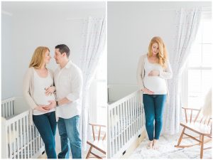 a redheaded pregnant woman and her family take maternity photos in her bangor, maine, home in a white neutral nursery